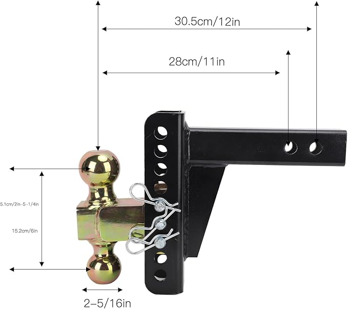 Dimensions: 2in receiver, 6in drop, 2 and 2-5/16 inch ball, load 14000lbs