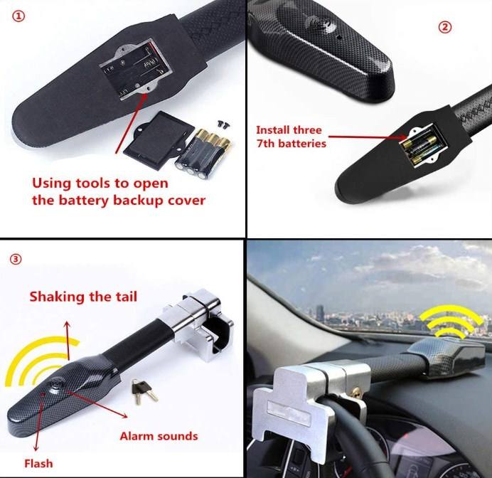 · DETERRENT: Flashing red LED indicator that increases speed when alarm has been activated. Inform thieves in advance that it is not a common steering wheel lock and to stay away from your vehicle. Anti-theft car steering wheel bar with security lock with anti-picking protection system. 2 reversible flat keys.