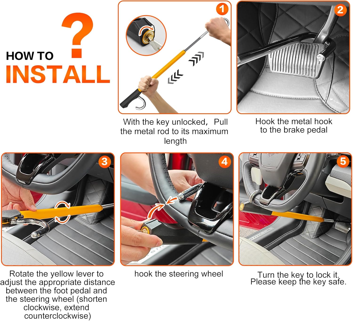 · [Easy to use] The retractable car locks can be installed in seconds. Simply snap the end with the lock cylinder onto the steering wheel and the other end onto the brake/pedal/clutch and lock it with the key
